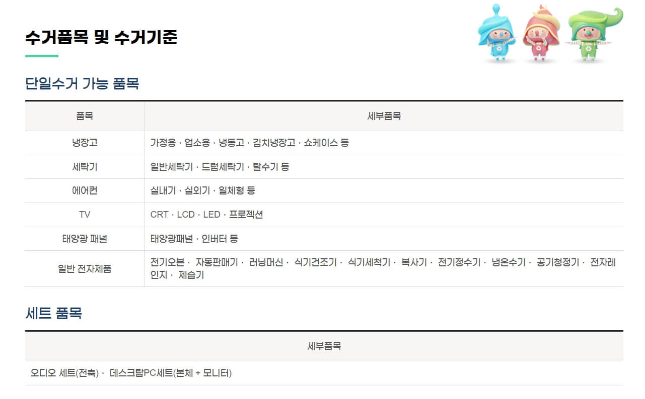 신청가능한 가전제품은 대형가전제품은 1개부터 배출이 가능하지만 소형 폐가전은 5개 이상일 때 신청이 가능합니다.