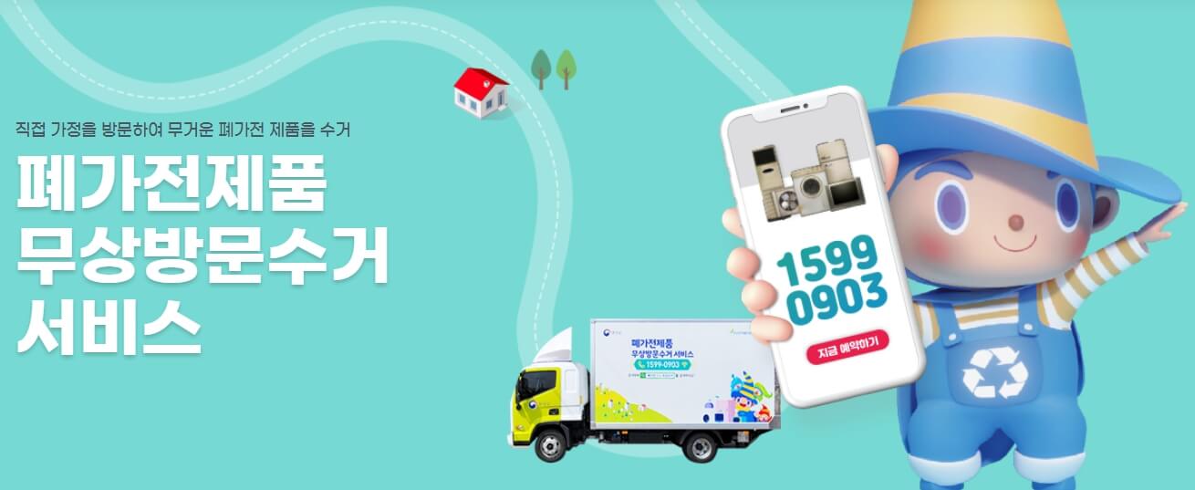 별도의 가입이 필요하지 않고 수수료를 낼 필요도 없이 무상으로 지정된 장소까지 운반을 하지 않아도 수거 기사가 직접 가정을 방문하여 무거운 폐가전제품을 수거해 가는 서비스를 말합니다.