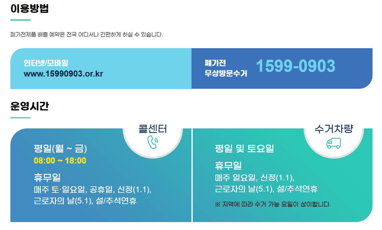 폐가전 무상 수거 서비스 신청은 인터넷이나 모바일로 신청이 가능하며 인터넷으로는 홈페이지를 통하여 신청이 가능하며 전화는 1599-0903을 통하여 평일 08:00 ~ 18:00까지 이용이 가능합니다.