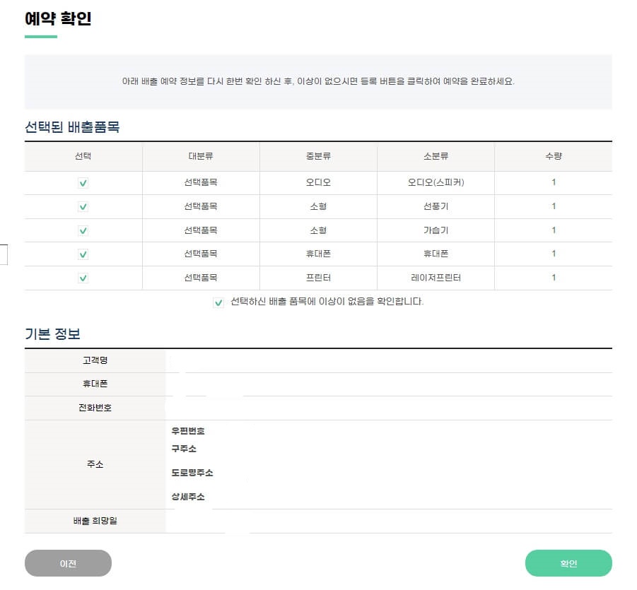 고객정보입력: 고객명, 휴대전화, 주소, 주거구분, 배출 희망일자를 기입합니다.